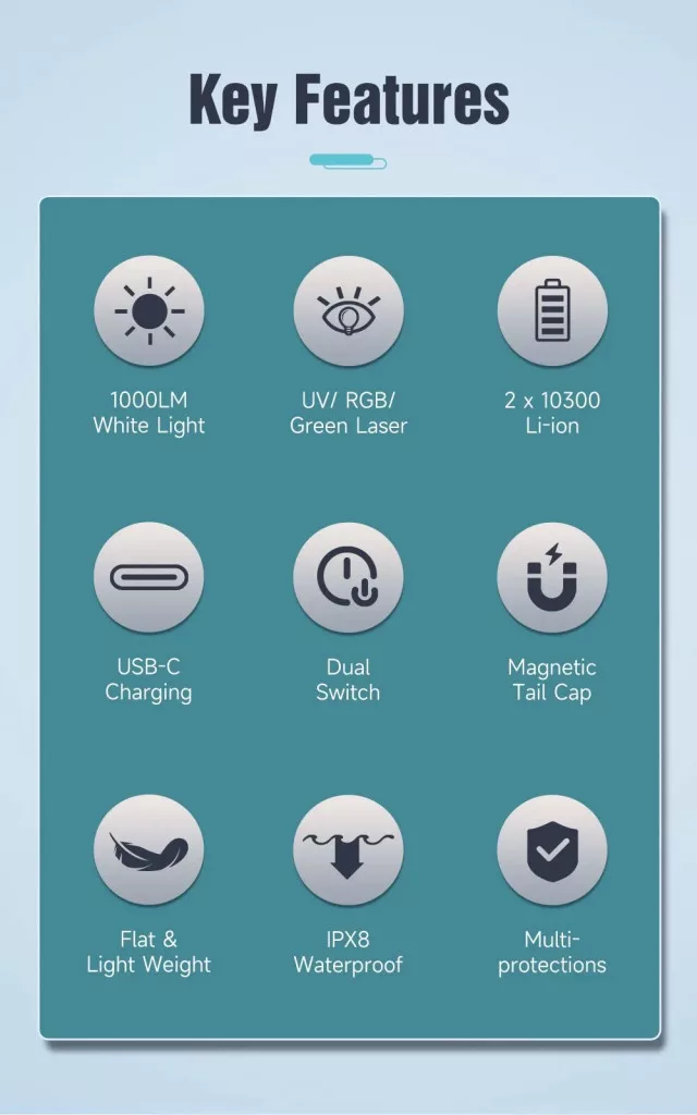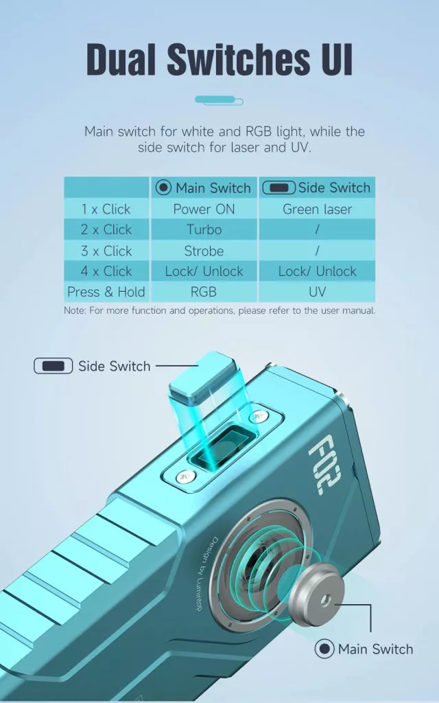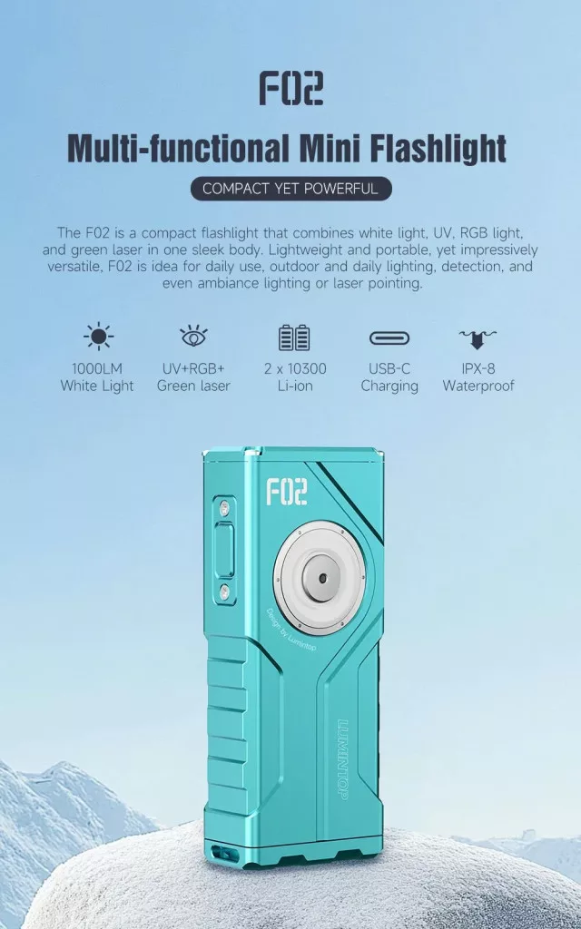 The F02 is a compact yet powerful 4-in-1 flashlight, combining 1000-lumen white light, 365nm UV, RGB light, and a green laser in a sleek, pocket-friendly design. Powered by dual replaceable 10300 Li-ion batteries with fast USB-C charging, it offers versatile lighting for outdoor adventures, inspections, signaling, and daily use. The dual independent switches provide quick control of main and function lights, while the magnetic tailcap enables hands-free operation. Built with 2m waterproof protection and multiple safety features, the F02 is ideal for both outdoor and daily lighting.