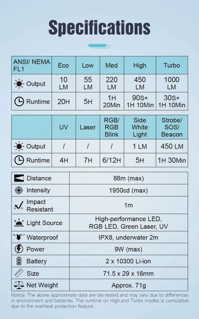 • High Output: Up to 1000 lumens white light for powerful illumination.