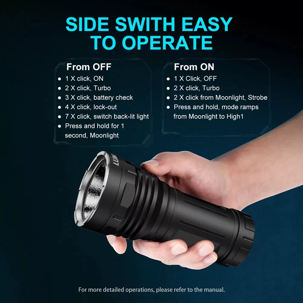 • Smooth ramping from Moonlight to High1, with Turbo, Strobe, SOS, and Beacon modes