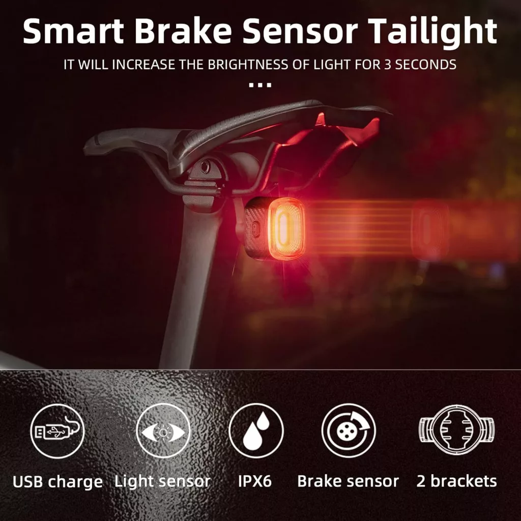 BRAKE SENSING AND AUTO ON/OFF: The bike light will highlight to remind the cars and pedestrians behind you when braking to make you safety ridding at night.This Smart bike rear light including Motion Sensor and Light Sensor, auto off when detect in no motion after 30 secs.Once shake it or detect the bike is moving, the bike back light will auto on again.(auto turn on or off in mode 1 or 2).Please choose the mode 3 and mode 4 to avoid Light Sensor working.