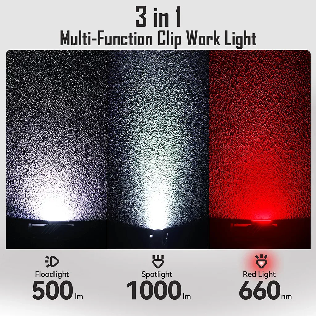 • 3-in-1 Light Setup: Super bright 1000-lumen main beam for distance, side white light for close-up tasks, plus a red light to protect your night vision—perfect for fishing, night walks, or reading.