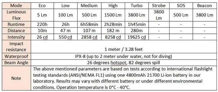 • Advanced Temperature Regulation (ATR) technology: As the temperature rises, SP35T is programmed to automatically step down and step up the brightness to prevent overheating.