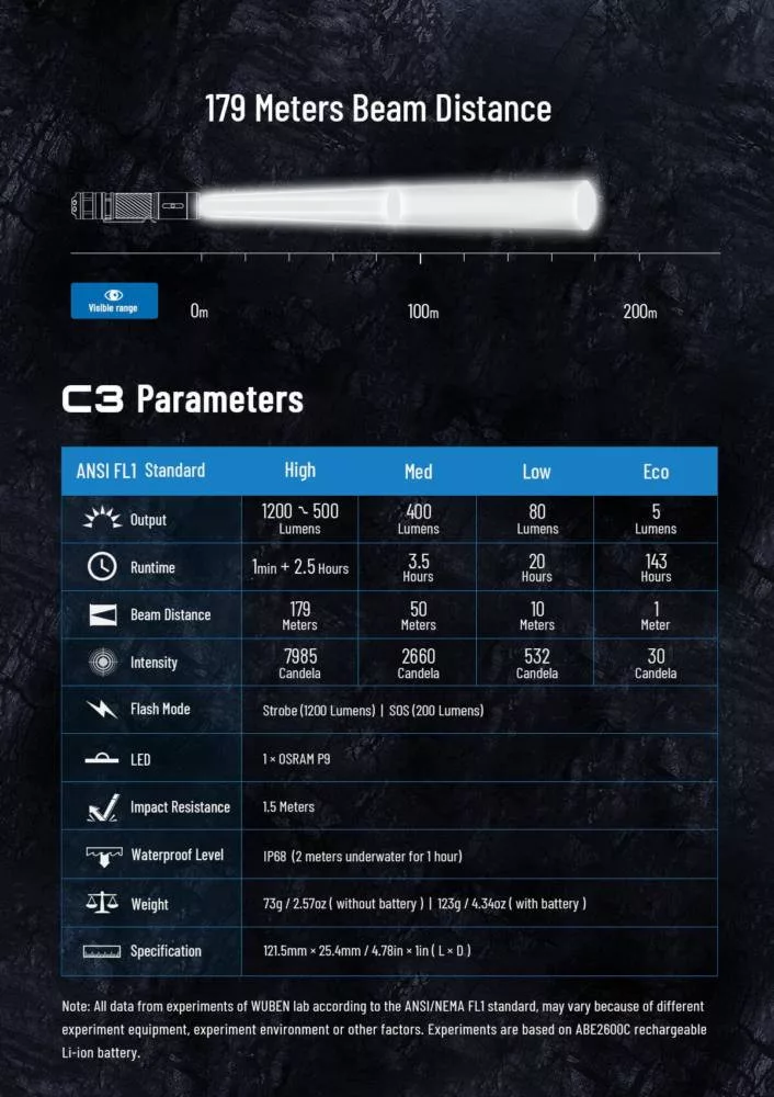 C3 is a cost-effective rechargeable outdoor and household flashlight. Utilized 1*OSRAM P9 LED, powered by 1*18650 Li-ion battery, it emits 1200 Lumens max output and throws 179 meters max beam distance.