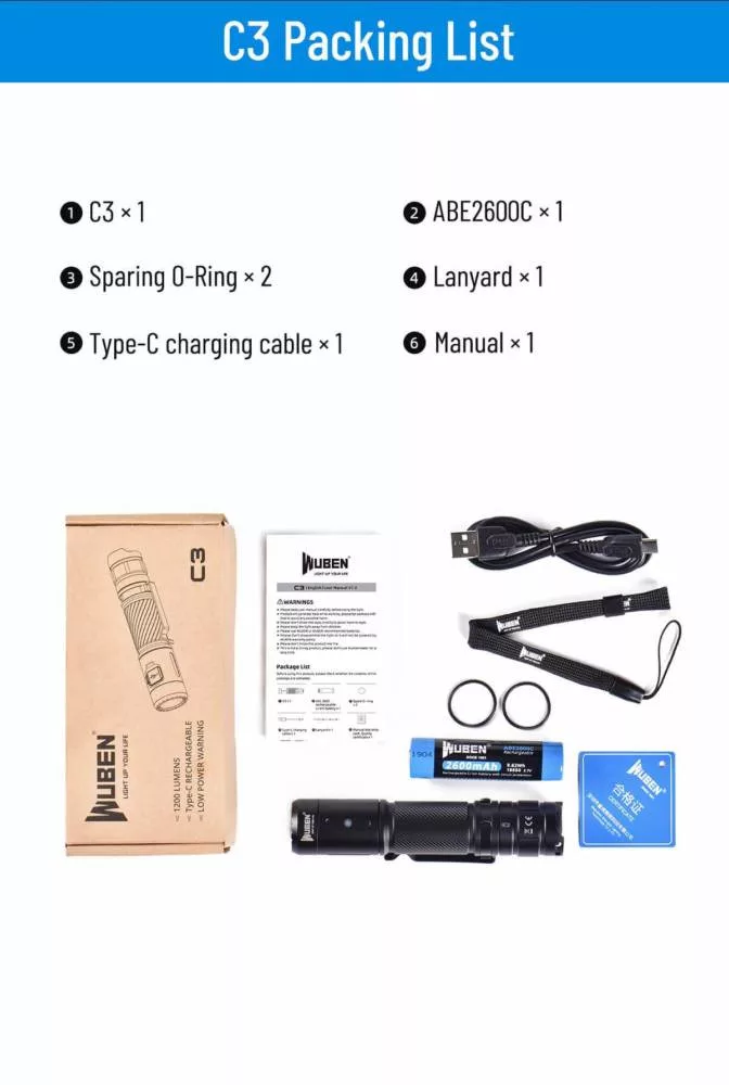 WUBEN C3 LED Flashlight USB Type-C Rechargeable 1200 Lumens IP68 Waterproof Camping lantern 18650 Battery included for Camping Mountaineering Emergency