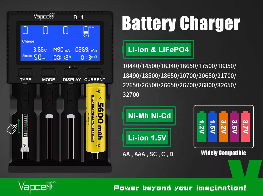 Vapcell BL4 4-slot Battery Charger For 18650 21700 Lithium Ion Rechargeable Batteries