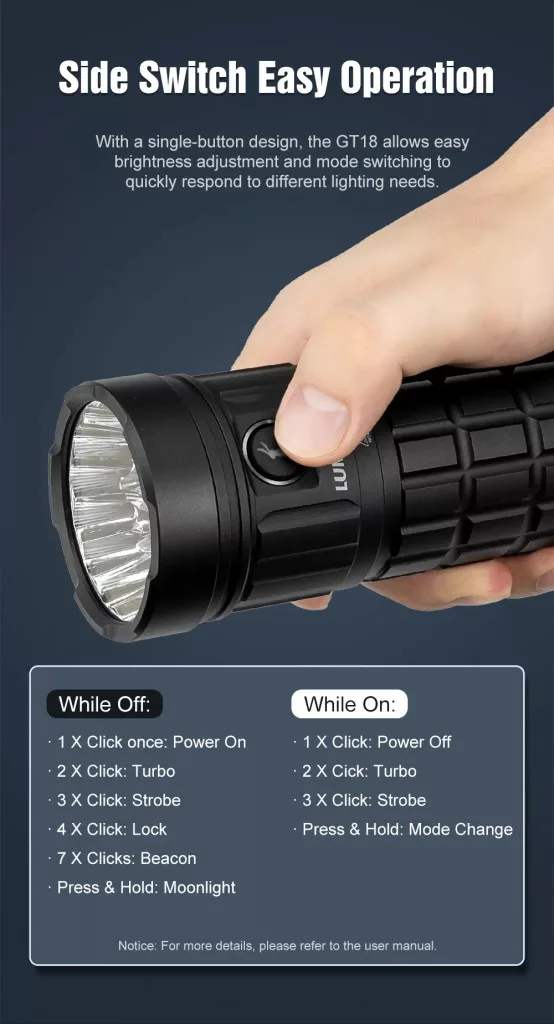 The GT18 7000 Lumens USB-C Direct Charge Outdoor Flashlight is a high-performance tool designed for extreme outdoor conditions. Featuring 8 high-performance LEDs, it provides up to 7000 lumens of bright light with a 400m beam range. Powered by a 32,000mAh lithium battery, it offers up to 60 days of battery life in moonlight mode. The USB-C charging port allows for fast recharging, and the flashlight also serves as a power bank with 22.5W fast charging output. With multiple protection features and an IPX8 waterproof rating, it ensures reliable performance in harsh environments. The GT18 is ideal for camping, hiking, and emergency situations, offering powerful illumination, long runtime, and safety.